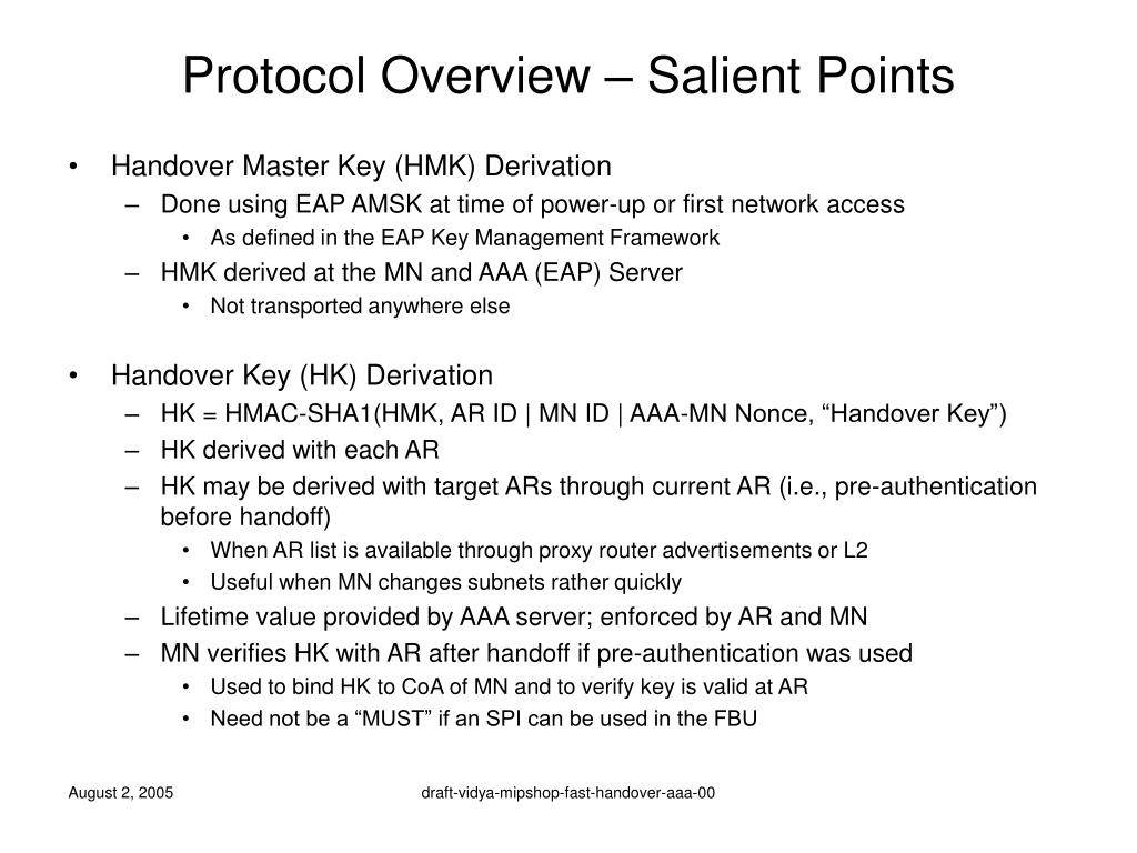 Protocol Overview – Salient Points • Handover Master Key (HMK) Derivation • Done using EAP AMSK at time of power-up or first network access • As defined in the EAP Key Management Framework • HMK derived at the MN and AAA (EAP) Server • Not transported anywhere else • Handover Key (HK) Derivation • HK = HMAC-SHA1(HMK, AR ID | MN ID | AAA-MN Nonce, “Handover Key”) • HK derived with each AR • HK may be derived with target ARs through current AR (i.e., pre-authentication before handoff) • When AR list is available through proxy router advertisements or L2 • Useful when MN changes subnets rather quickly • Lifetime value provided by AAA server; enforced by AR and MN • MN verifies HK with AR after handoff if pre-authentication was used • Used to bind HK to CoA of MN and to verify key is valid at AR • Need not be a “MUST” if an SPI can be used in the FBU draft-vidya-mipshop-fast-handover-aaa-00