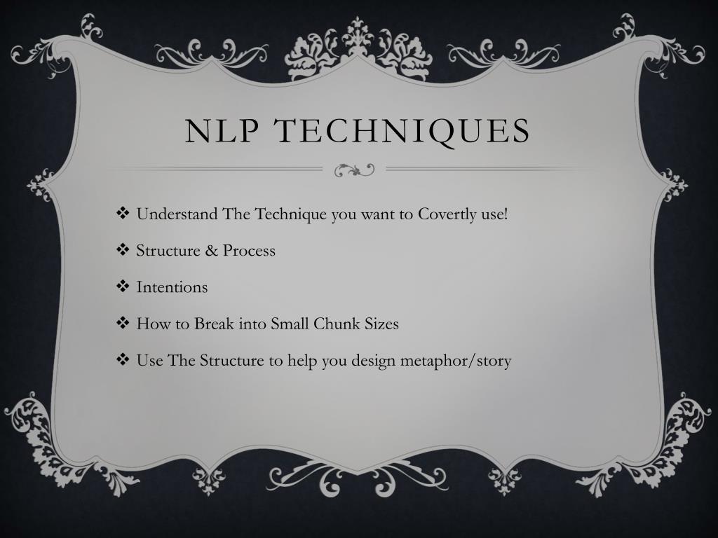 NLP Techniques • Understand The Technique you want to Covertly use! • Structure & Process • Intentions • How to Break into Small Chunk Sizes • Use The Structure to help you design metaphor/story
