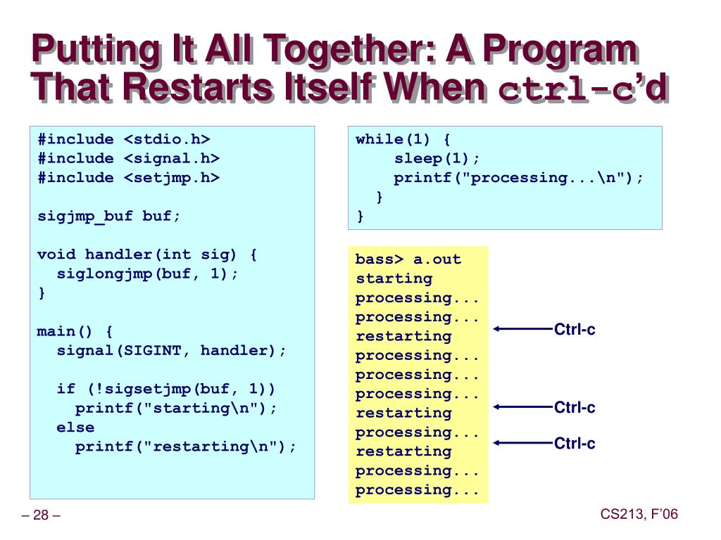 Putting It All Together: A Program That Restarts Itself When ctrl-c’d #include <stdio.h> #include <signal.h> #include <setjmp.h> sigjmp_buf buf; void handler(int sig) { siglongjmp(buf, 1); } main() { signal(SIGINT, handler); if (!sigsetjmp(buf, 1)) printf("starting\n"); else printf("restarting\n"); while(1) { sleep(1); printf("processing...\n"); } } bass> a.out starting processing... processing... restarting processing... processing... processing... restarting processing... restarting processing... processing... Ctrl-c Ctrl-c Ctrl-c