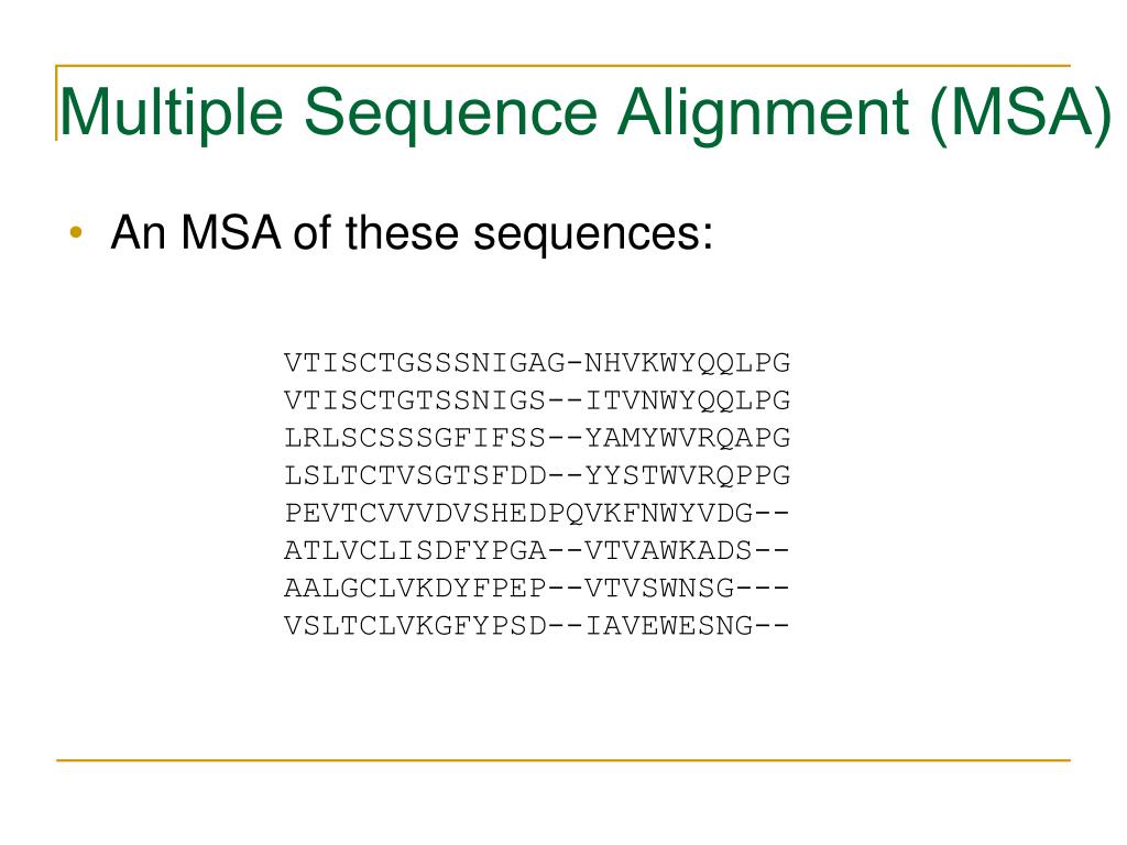 Multiple Sequence Alignment (MSA) • What is multiple sequence alignment? • Given k sequences: VTISCTGSSSNIGAGNHVKWYQQLPG VTISCTGTSSNIGSITVNWYQQLPG LRLSCSSSGFIFSSYAMYWVRQAPG LSLTCTVSGTSFDDYYSTWVRQPPG PEVTCVVVDVSHEDPQVKFNWYVDG ATLVCLISDFYPGAVTVAWKADS AALGCLVKDYFPEPVTVSWNSG VSLTCLVKGFYPSDIAVEWESNG