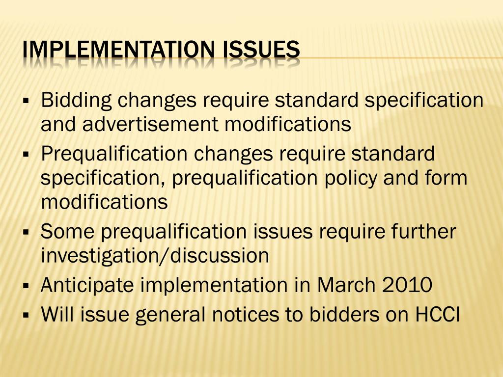 Bidding changes require standard specification and advertisement modifications • Prequalification changes require standard specification, prequalification policy and form modifications • Some prequalification issues require further investigation/discussion • Anticipate implementation in March 2010 • Will issue general notices to bidders on HCCI Implementation issues