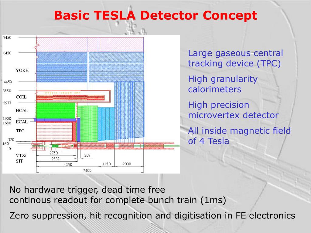 Basic TESLA Detector Concept Large gaseous central tracking device (TPC) High granularity calorimeters High precision microvertex detector All inside magnetic field of 4 Tesla No hardware trigger, dead time free continous readout for complete bunch train (1ms) Zero suppression, hit recognition and digitisation in FE electronics