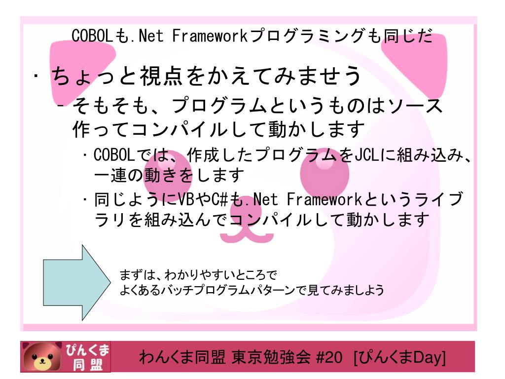 COBOLも.Net Frameworkプログラミングも同じだ • ちょっと視点をかえてみませう • そもそも、プログラムというものはソース作ってコンパイルして動かします • COBOLでは、作成したプログラムをJCLに組み込み、一連の動きをします • 同じようにVBやC#も.Net Frameworkというライブラリを組み込んでコンパイルして動かします まずは、わかりやすいところで よくあるバッチプログラムパターンで見てみましよう
