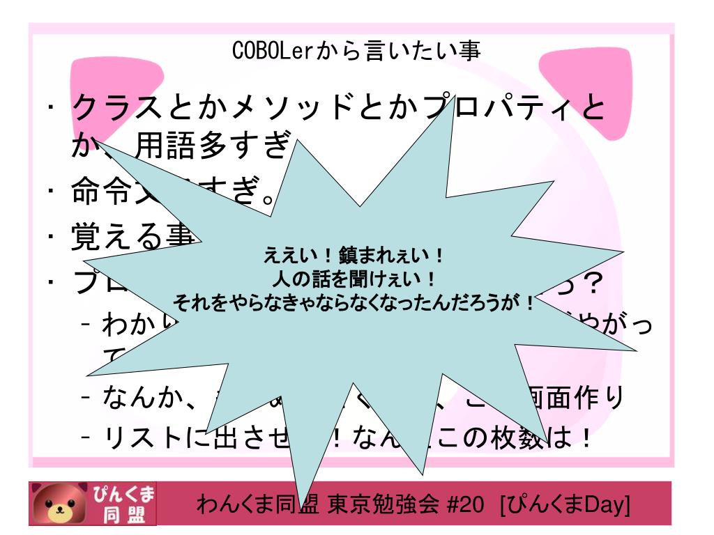 COBOLerから言いたい事 • クラスとかメソッドとかプロパティとか、用語多すぎ。 • 命令文多すぎ。 • 覚える事多すぎ。 • プログラムは1ファイルでガチだろ? • わかりにくいよ、あっちこっちに飛びやがって! • なんか、もうめんどくせぇ、この画面作り • リストに出させろ!なんだこの枚数は! ええい!鎮まれぇい! 人の話を聞けぇい! それをやらなきゃならなくなったんだろうが!