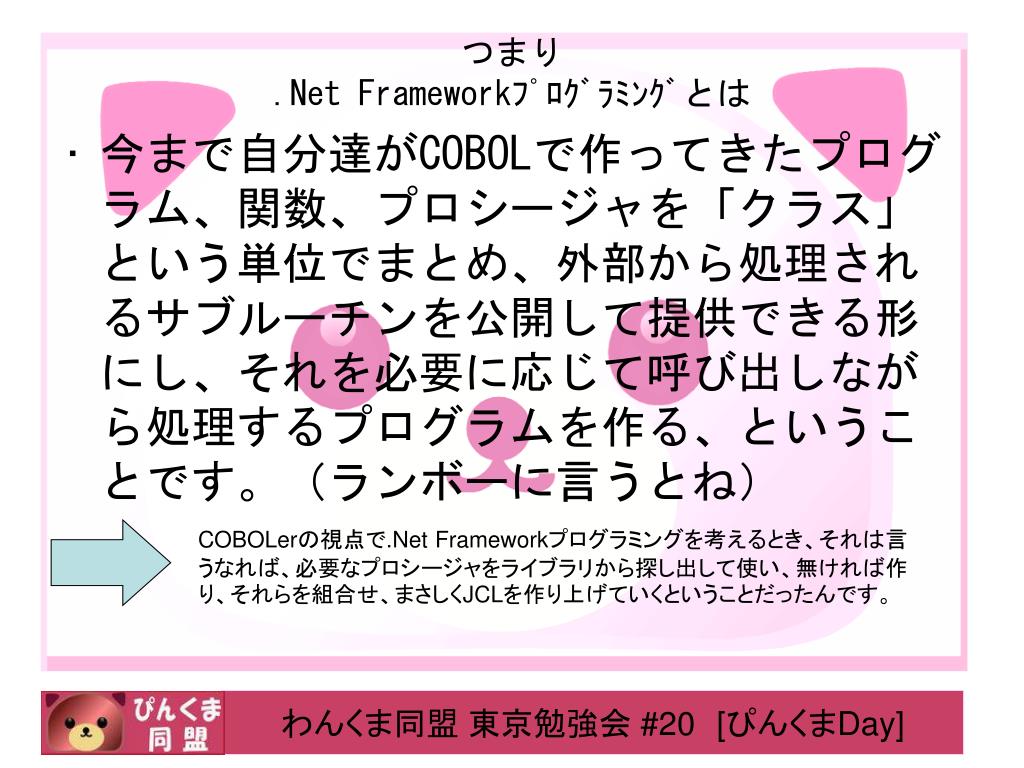 つまり.Net Frameworkプログラミングとは • 今まで自分達がCOBOLで作ってきたプログラム、関数、プロシージャを「クラス」という単位でまとめ、外部から処理されるサブルーチンを公開して提供できる形にし、それを必要に応じて呼び出しながら処理するプログラムを作る、ということです。(ランボーに言うとね) COBOLerの視点で.Net Frameworkプログラミングを考えるとき、それは言うなれば、必要なプロシージャをライブラリから探し出して使い、無ければ作り、それらを組合せ、まさしくJCLを作り上げていくということだったんです。