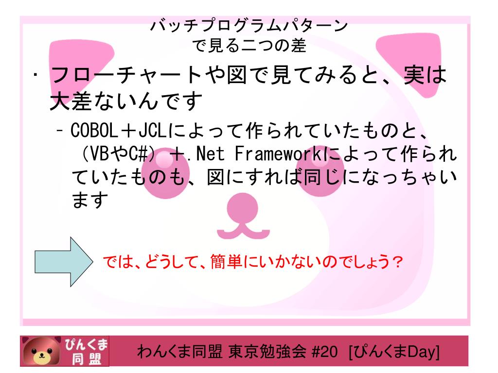 バッチプログラムパターンで見る二つの差 • フローチャートや図で見てみると、実は大差ないんです • COBOL+JCLによって作られていたものと、(VBやC#)+.Net Frameworkによって作られていたものも、図にすれば同じになっちゃいます では、どうして、簡単にいかないのでしょう?