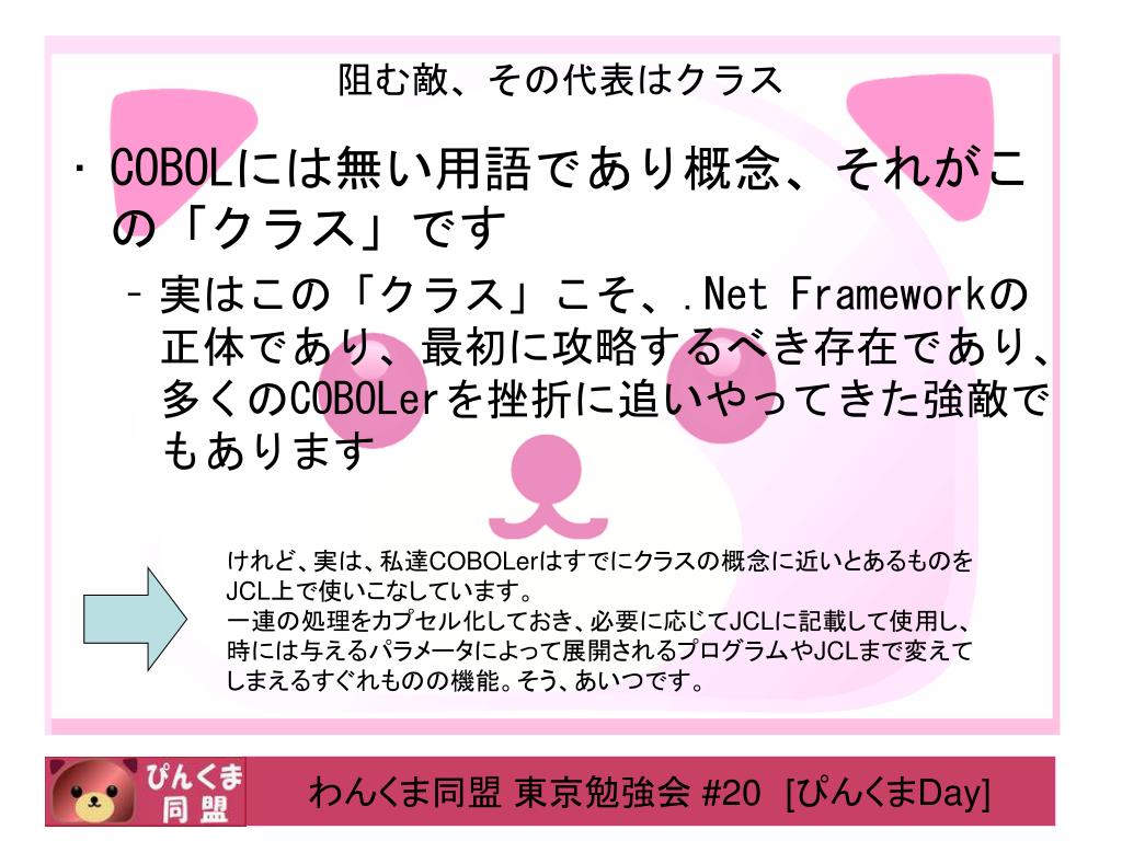 阻む敵、その代表はクラス • COBOLには無い用語であり概念、それがこの「クラス」です • 実はこの「クラス」こそ、.Net Frameworkの正体であり、最初に攻略するべき存在であり、多くのCOBOLerを挫折に追いやってきた強敵でもあります けれど、実は、私達COBOLerはすでにクラスの概念に近いとあるものをJCL上で使いこなしています。 一連の処理をカプセル化しておき、必要に応じてJCLに記載して使用し、時には与えるパラメータによって展開されるプログラムやJCLまで変えてしまえるすぐれものの機能。そう、あいつです。