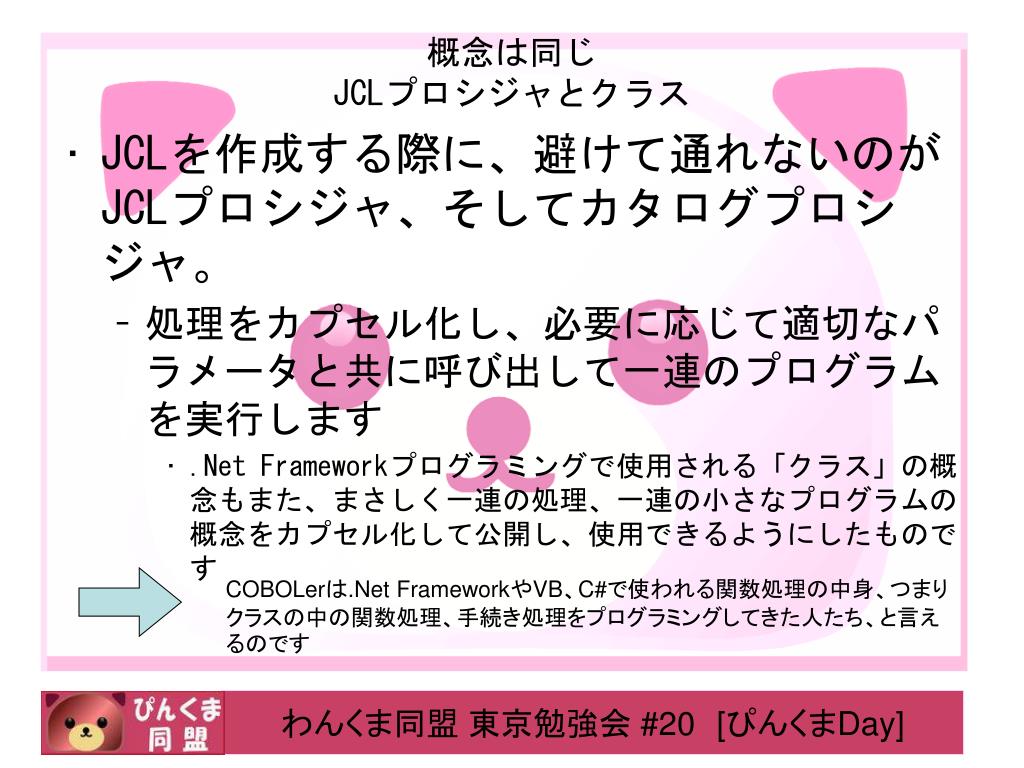 概念は同じJCLプロシジャとクラス • JCLを作成する際に、避けて通れないのがJCLプロシジャ、そしてカタログプロシジャ。 • 処理をカプセル化し、必要に応じて適切なパラメータと共に呼び出して一連のプログラムを実行します • .Net Frameworkプログラミングで使用される「クラス」の概念もまた、まさしく一連の処理、一連の小さなプログラムの概念をカプセル化して公開し、使用できるようにしたものです COBOLerは.Net FrameworkやVB、C#で使われる関数処理の中身、つまりクラスの中の関数処理、手続き処理をプログラミングしてきた人たち、と言えるのです