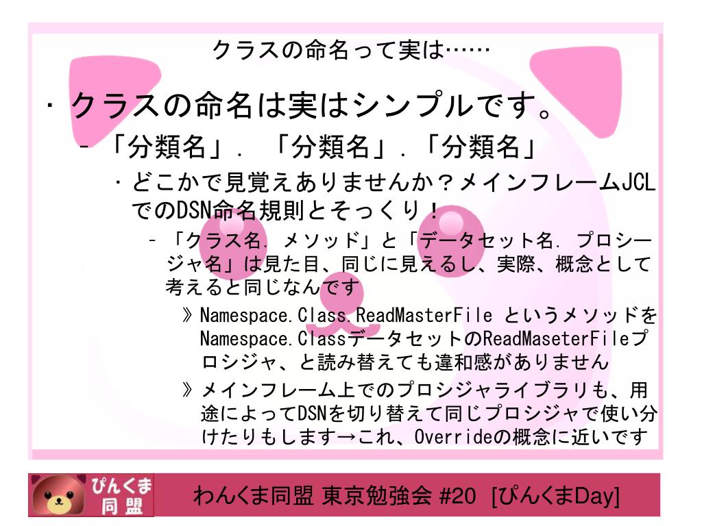 クラスの命名って実は…… • クラスの命名は実はシンプルです。 • 「分類名」.「分類名」.「分類名」 • どこかで見覚えありませんか?メインフレームJCLでのDSN命名規則とそっくり! • 「クラス名.メソッド」と「データセット名.プロシージャ名」は見た目、同じに見えるし、実際、概念として考えると同じなんです • Namespace.Class.ReadMasterFile というメソッドをNamespace.ClassデータセットのReadMaseterFileプロシジャ、と読み替えても違和感がありません • メインフレーム上でのプロシジャライブラリも、用途によってDSNを切り替えて同じプロシジャで使い分けたりもします→これ、Overrideの概念に近いです