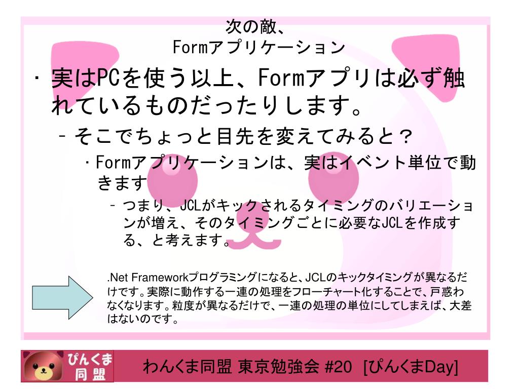 次の敵、Formアプリケーション • 実はPCを使う以上、Formアプリは必ず触れているものだったりします。 • そこでちょっと目先を変えてみると? • Formアプリケーションは、実はイベント単位で動きます • つまり、JCLがキックされるタイミングのバリエーションが増え、そのタイミングごとに必要なJCLを作成する、と考えます。 .Net Frameworkプログラミングになると、JCLのキックタイミングが異なるだけです。実際に動作する一連の処理をフローチャート化することで、戸惑わなくなります。粒度が異なるだけで、一連の処理の単位にしてしまえば、大差はないのです。