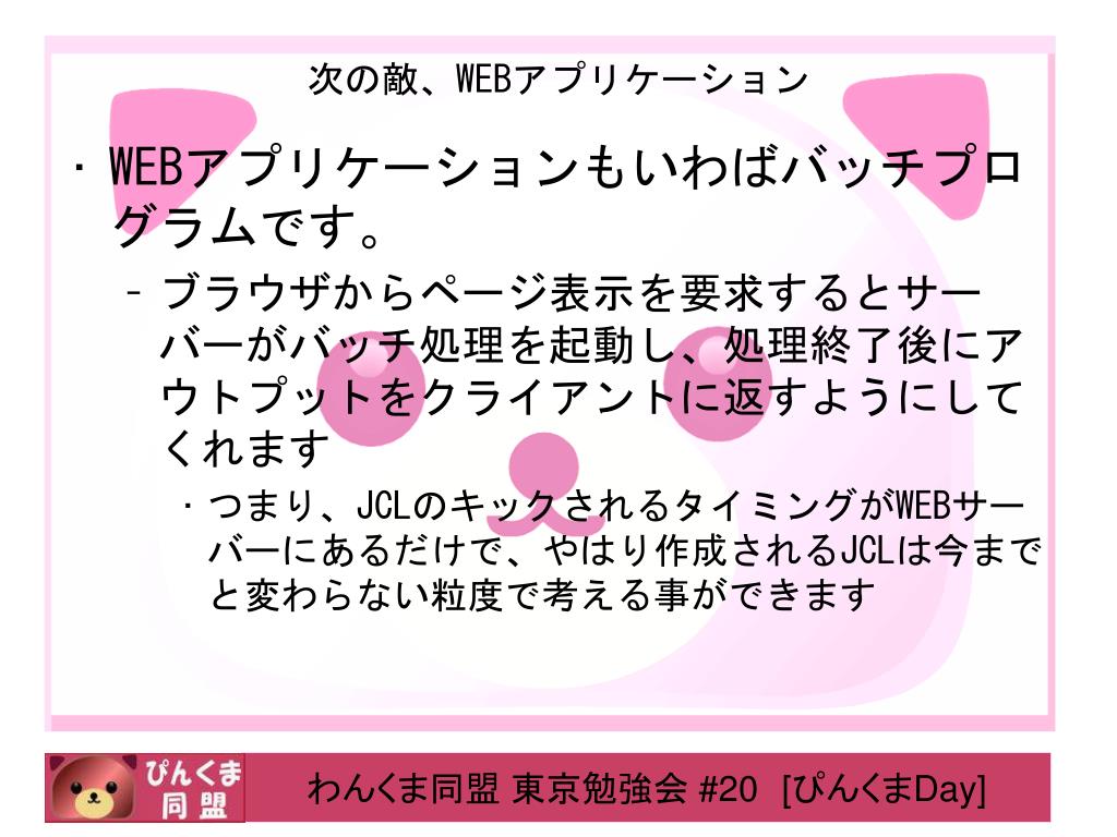 次の敵、WEBアプリケーション • WEBアプリケーションもいわばバッチプログラムです。 • ブラウザからページ表示を要求するとサーバーがバッチ処理を起動し、処理終了後にアウトプットをクライアントに返すようにしてくれます • つまり、JCLのキックされるタイミングがWEBサーバーにあるだけで、やはり作成されるJCLは今までと変わらない粒度で考える事ができます