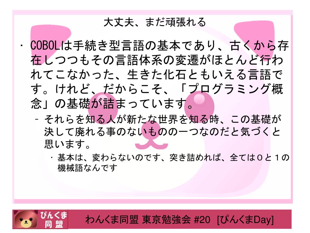 大丈夫、まだ頑張れる • COBOLは手続き型言語の基本であり、古くから存在しつつもその言語体系の変遷がほとんど行われてこなかった、生きた化石ともいえる言語です。けれど、だからこそ、「プログラミング概念」の基礎が詰まっています。 • それらを知る人が新たな世界を知る時、この基礎が決して廃れる事のないものの一つなのだと気づくと思います。 • 基本は、変わらないのです、突き詰めれば、全ては0と1の機械語なんです