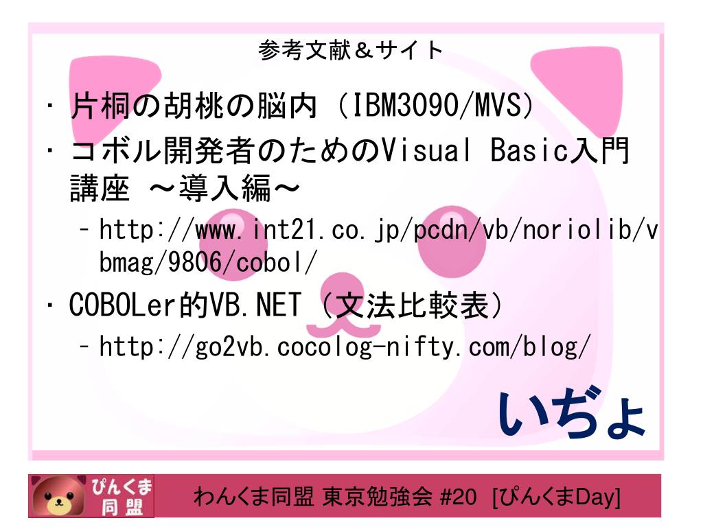 参考文献&サイト • 片桐の胡桃の脳内(IBM3090/MVS) • コボル開発者のためのVisual Basic入門講座 ~導入編~ • http://www.int21.co.jp/pcdn/vb/noriolib/vbmag/9806/cobol/ • COBOLer的VB.NET(文法比較表) • http://go2vb.cocolog-nifty.com/blog/ いぢょ