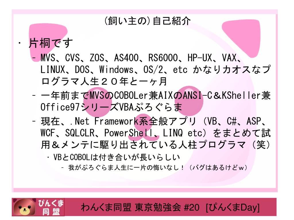(飼い主の)自己紹介 • 片桐です • MVS、CVS、ZOS、AS400、RS6000、HP-UX、VAX、LINUX、DOS、Windows、OS/2、etc かなりカオスなプログラマ人生20年と一ヶ月 • 一年前までMVSのCOBOLer兼AIXのANSI-C&KSheller兼Office97シリーズVBAぷろぐらま • 現在、.Net Framework系全般アプリ(VB、C#、ASP、WCF、SQLCLR、PowerShell、LINQetc)をまとめて試用&メンテに駆り出されている人柱プログラマ(笑) • VBとCOBOLは付き合いが長いらしい • 我がぷろぐらま人生に一片の悔いなし!(バグはあるけどw)