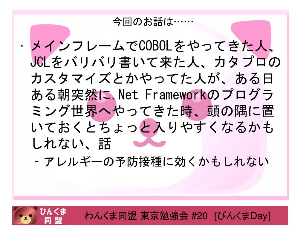 今回のお話は…… • メインフレームでCOBOLをやってきた人、JCLをバリバリ書いて来た人、カタプロのカスタマイズとかやってた人が、ある日ある朝突然に.Net Frameworkのプログラミング世界へやってきた時、頭の隅に置いておくとちょっと入りやすくなるかもしれない、話 • アレルギーの予防接種に効くかもしれない