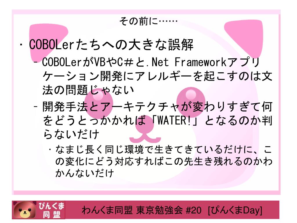 その前に…… • COBOLerたちへの大きな誤解 • COBOLerがVBやC#と.Net Frameworkアプリケーション開発にアレルギーを起こすのは文法の問題じゃない • 開発手法とアーキテクチャが変わりすぎて何をどうとっかかれば「WATER!」となるのか判らないだけ • なまじ長く同じ環境で生きてきているだけに、この変化にどう対応すればこの先生き残れるのかわかんないだけ