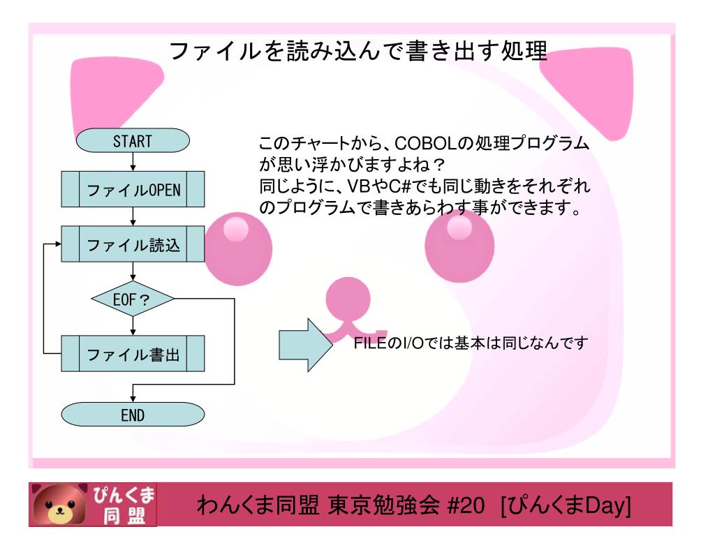 ファイルを読み込んで書き出す処理 このチャートから、COBOLの処理プログラムが思い浮かびますよね? 同じように、VBやC#でも同じ動きをそれぞれのプログラムで書きあらわす事ができます。 START ファイルOPEN ファイル読込 FILEのI/Oでは基本は同じなんです EOF? ファイル書出 END
