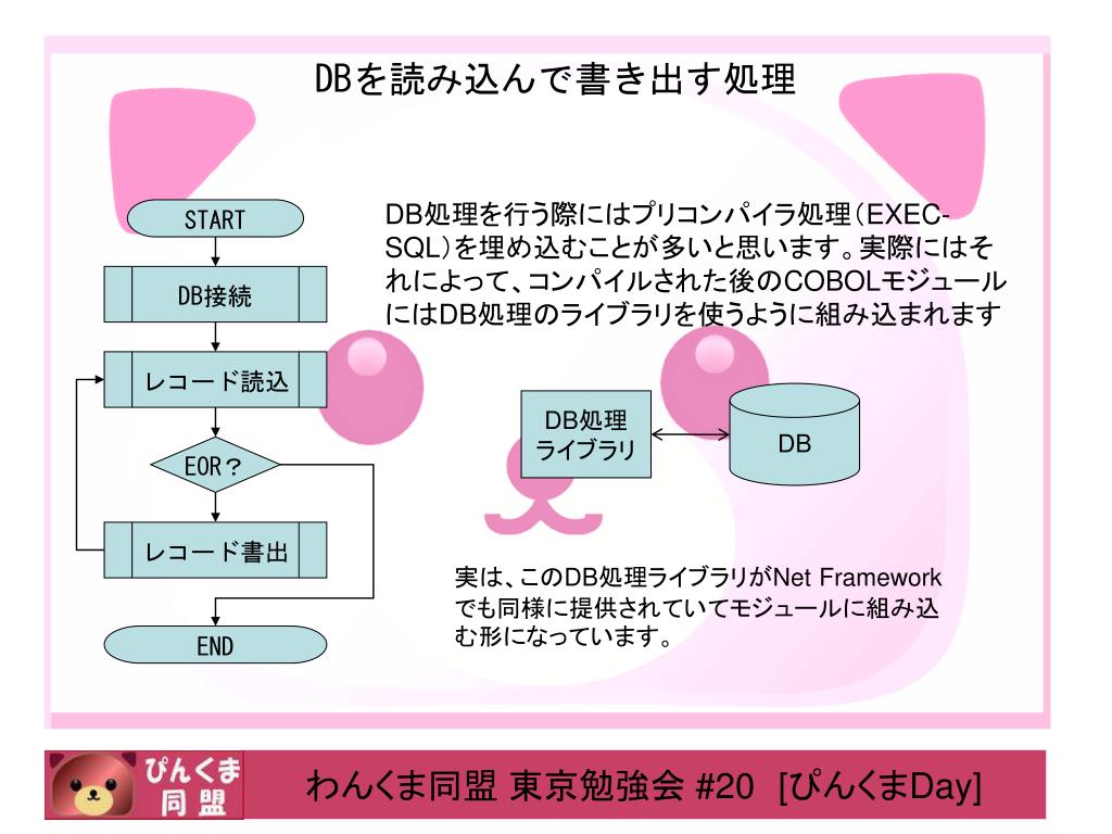 DBを読み込んで書き出す処理 DB処理を行う際にはプリコンパイラ処理(EXEC-SQL)を埋め込むことが多いと思います。実際にはそれによって、コンパイルされた後のCOBOLモジュールにはDB処理のライブラリを使うように組み込まれます START DB DB処理 ライブラリ DB接続 レコード読込 実は、このDB処理ライブラリがNet Frameworkでも同様に提供されていてモジュールに組み込む形になっています。 EOR? レコード書出 END