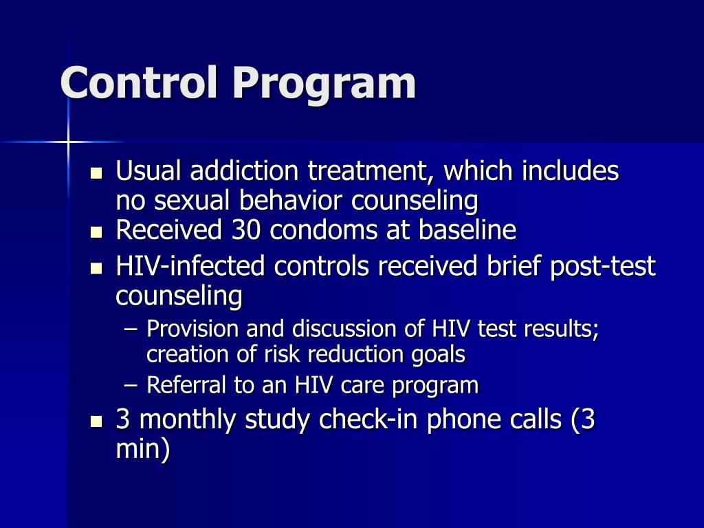 Control Program • Usual addiction treatment, which includes no sexual behavior counseling • Received 30 condoms at baseline • HIV-infected controls received brief post-test counseling • Provision and discussion of HIV test results; creation of risk reduction goals • Referral to an HIV care program • 3 monthly study check-in phone calls (3 min)