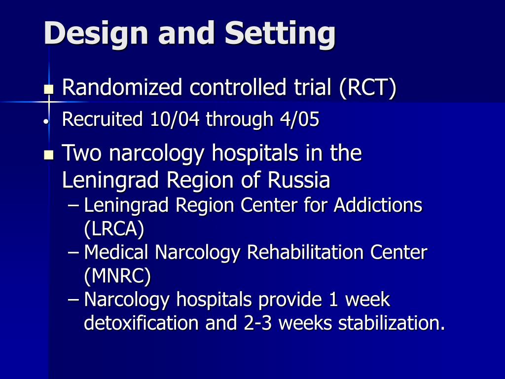 Design and Setting • Randomized controlled trial (RCT) • Recruited 10/04 through 4/05 • Two narcology hospitals in the Leningrad Region of Russia • Leningrad Region Center for Addictions (LRCA) • Medical Narcology Rehabilitation Center (MNRC) • Narcology hospitals provide 1 week detoxification and 2-3 weeks stabilization.