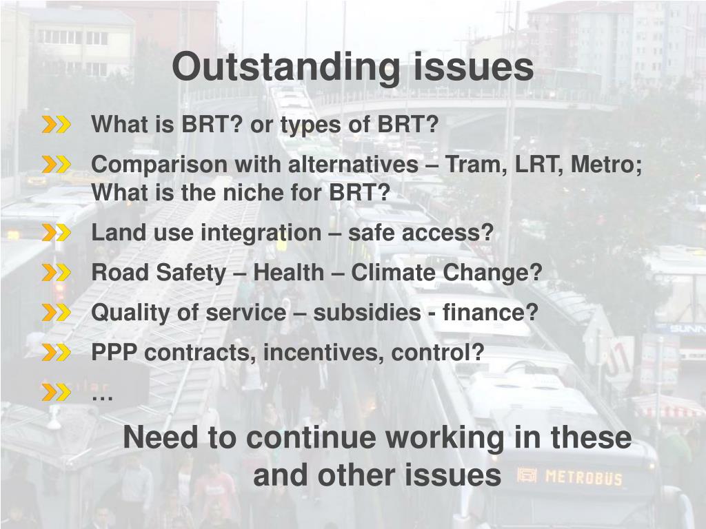 Outstandingissues • What is BRT? or types of BRT? • Comparison with alternatives – Tram, LRT, Metro; What is the niche for BRT? • Land use integration – safe access? • Road Safety – Health – Climate Change? • Quality of service – subsidies - finance? • PPP contracts, incentives, control? • … Need to continue working in these and other issues
