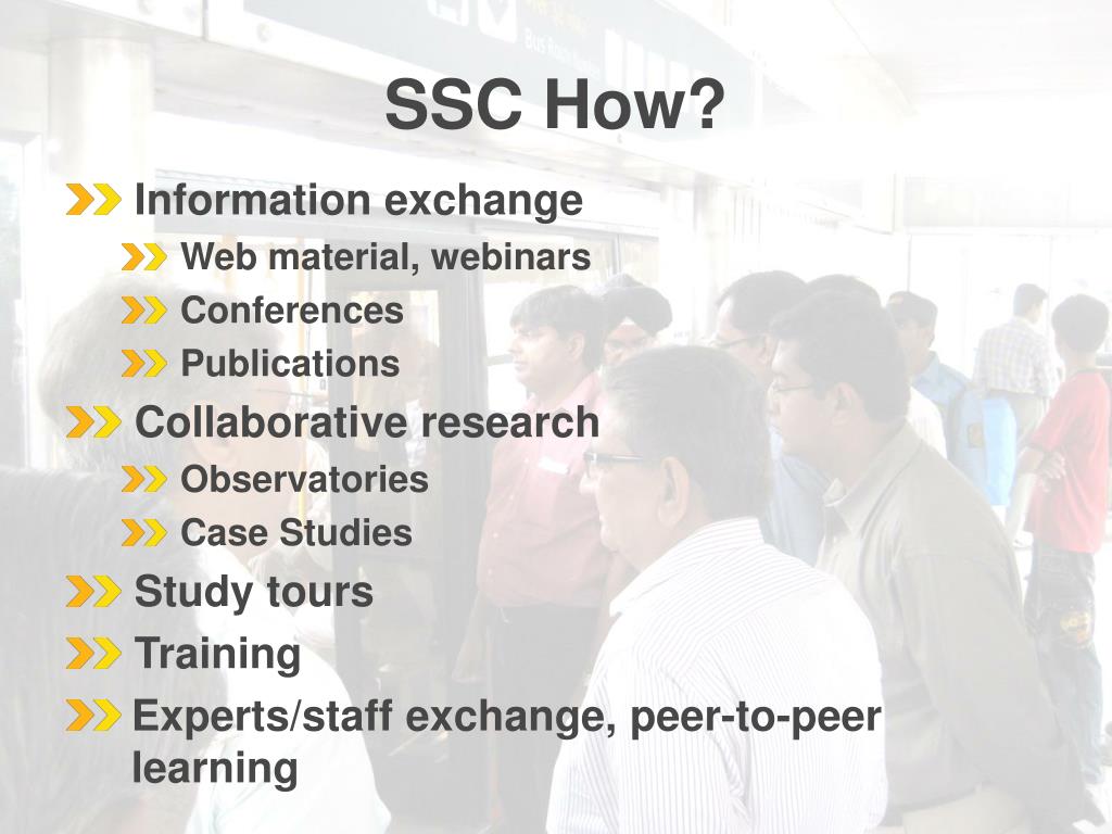 SSC How? • Informationexchange • Web material, webinars • Conferences • Publications • Collaborativeresearch • Observatories • Case Studies • Study tours • Training • Experts/staff exchange, peer-to-peer learning