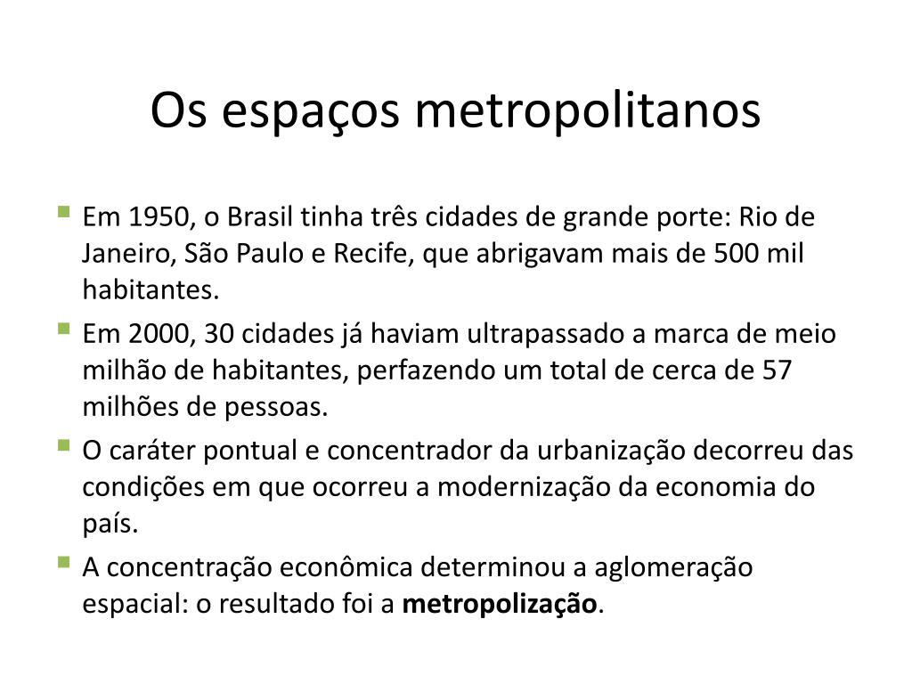 Os espaços metropolitanos • Em 1950, o Brasil tinha três cidades de grande porte: Rio de Janeiro, São Paulo e Recife, que abrigavam mais de 500 mil habitantes. • Em 2000, 30 cidades já haviam ultrapassado a marca de meio milhão de habitantes, perfazendo um total de cerca de 57 milhões de pessoas. • O caráter pontual e concentrador da urbanização decorreu das condições em que ocorreu a modernização da economia do país. • A concentração econômica determinou a aglomeração espacial: o resultado foi a metropolização.