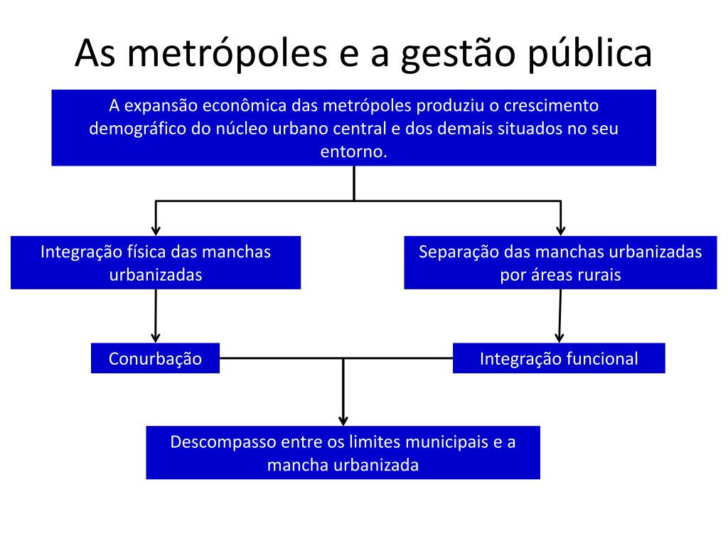 As metrópoles e a gestão pública A expansão econômica das metrópoles produziu o crescimento demográfico do núcleo urbano central e dos demais situados no seu entorno. Integração física das manchas urbanizadas Separação das manchas urbanizadas por áreas rurais Conurbação Integração funcional Descompasso entre os limites municipais e a mancha urbanizada