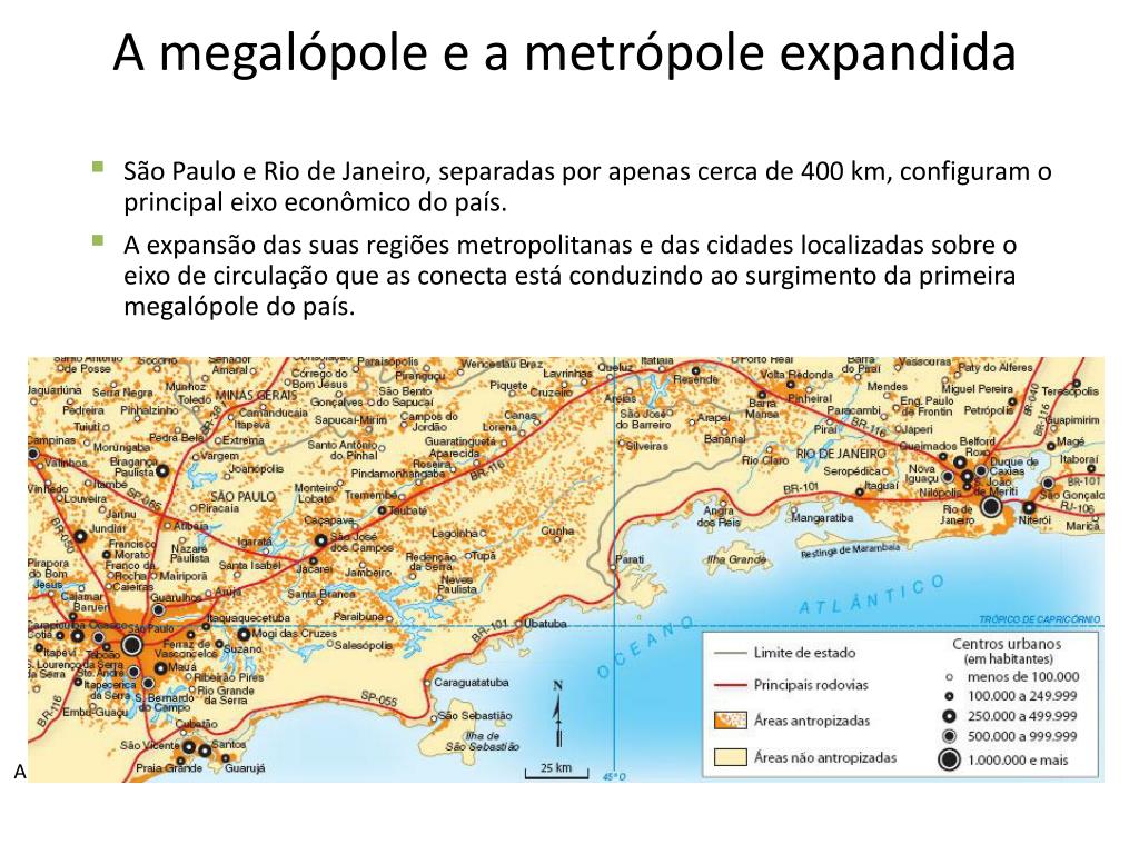 A megalópole e a metrópole expandida • São Paulo e Rio de Janeiro, separadas por apenas cerca de 400 km, configuram o principal eixo econômico do país. • A expansão das suas regiões metropolitanas e das cidades localizadas sobre o eixo de circulação que as conecta está conduzindo ao surgimento da primeira megalópole do país. A megalópole em formação