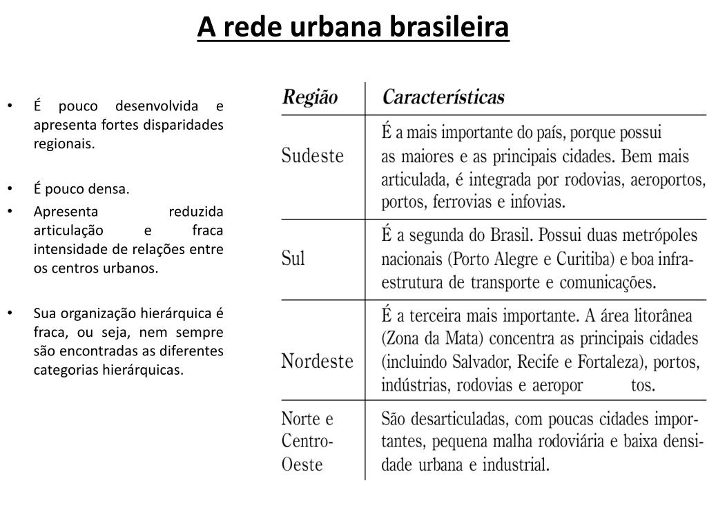 A rede urbana brasileira • É pouco desenvolvida e apresenta fortes disparidades regionais. • É pouco densa. • Apresenta reduzida articulação e fraca intensidade de relações entre os centros urbanos. • Sua organização hierárquica é fraca, ou seja, nem sempre são encontradas as diferentes categorias hierárquicas.
