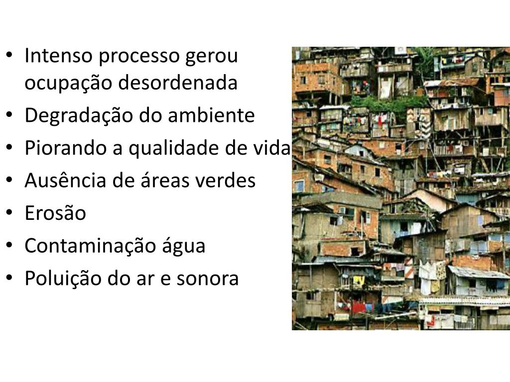 Intenso processo gerou ocupação desordenada • Degradação do ambiente • Piorando a qualidade de vida • Ausência de áreas verdes • Erosão • Contaminação água • Poluição do ar e sonora