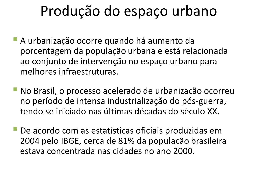 Produção do espaço urbano • A urbanização ocorre quando há aumento da porcentagem da população urbana e está relacionada ao conjunto de intervenção no espaço urbano para melhores infraestruturas. • No Brasil, o processo acelerado de urbanização ocorreu no período de intensa industrialização do pós-guerra, tendo se iniciado nas últimas décadas do século XX. • De acordo com as estatísticas oficiais produzidas em 2004 pelo IBGE, cerca de 81% da população brasileira estava concentrada nas cidades no ano 2000.