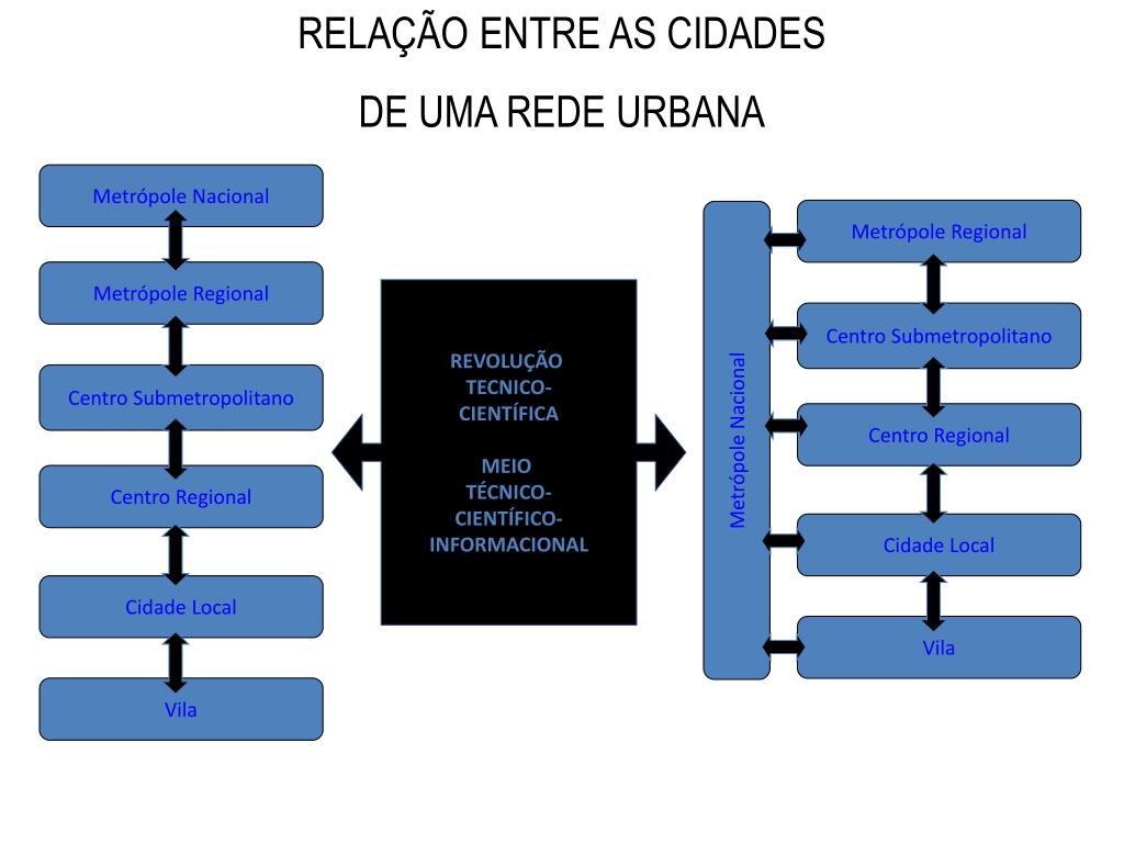 RELAÇÃO ENTRE AS CIDADES DE UMA REDE URBANA Metrópole Nacional Metrópole Regional Metrópole Regional Centro Submetropolitano Centro Submetropolitano Metrópole Nacional Centro Regional Centro Regional Cidade Local Cidade Local Vila Vila REVOLUÇÃO TECNICO- CIENTÍFICA MEIO TÉCNICO- CIENTÍFICO- INFORMACIONAL