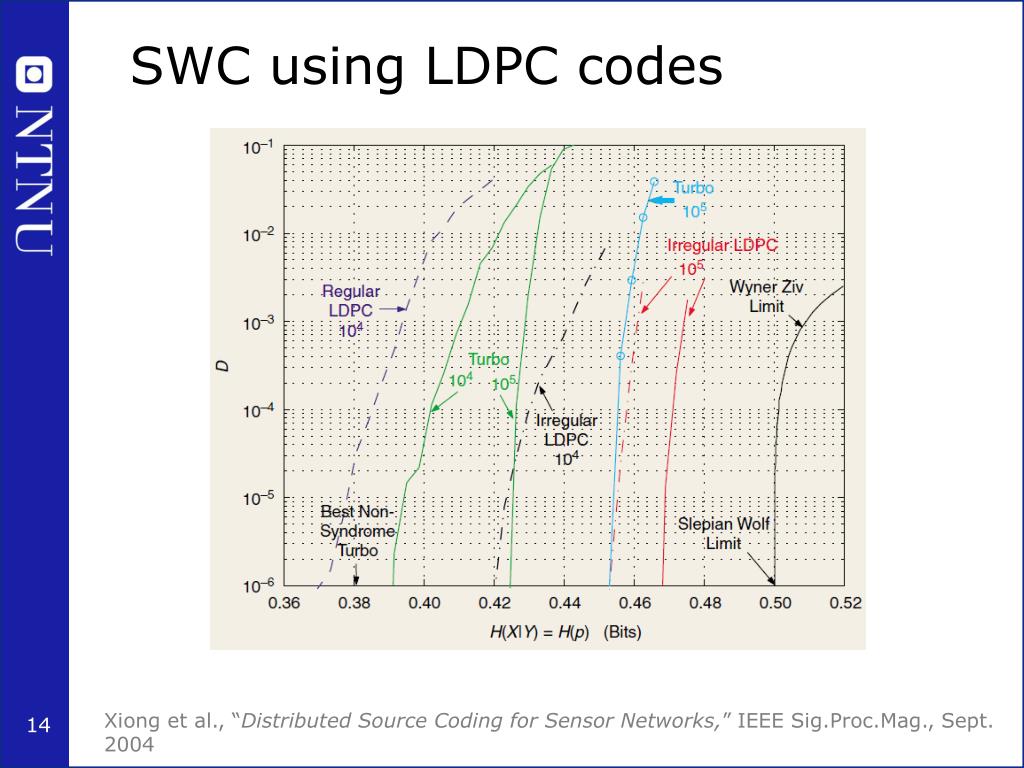 SWC using LDPC codes Xiong et al., “Distributed Source Coding for Sensor Networks,” IEEE Sig.Proc.Mag., Sept. 2004