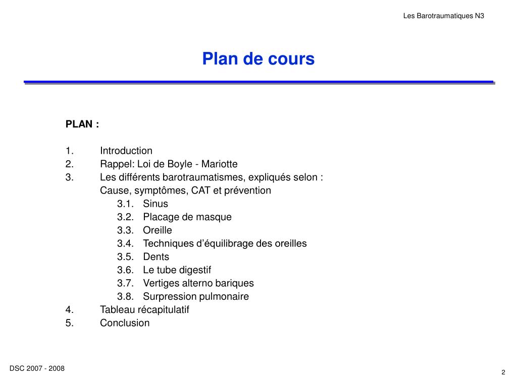 Les Barotraumatiques N3 Plan de cours PLAN : 1. Introduction 2. Rappel: Loi de Boyle - Mariotte 3. Les différents barotraumatismes, expliqués selon : Cause, symptômes, CAT et prévention 3.1. Sinus 3.2. Placage de masque 3.3. Oreille 3.4. Techniques d’équilibrage des oreilles 3.5. Dents 3.6. Le tube digestif 3.7. Vertiges alterno bariques 3.8. Surpression pulmonaire • Tableau récapitulatif • Conclusion