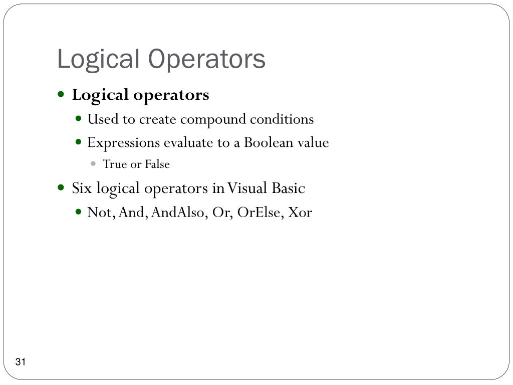 Logical Operators • Logical operators • Used to create compound conditions • Expressions evaluate to a Boolean value • True or False • Six logical operators in Visual Basic • Not, And, AndAlso, Or, OrElse, Xor