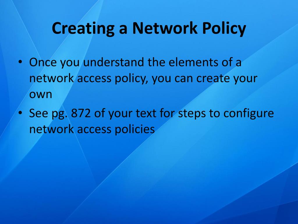 Creating a Network Policy • Once you understand the elements of a network access policy, you can create your own • See pg. 872 of your text for steps to configure network access policies