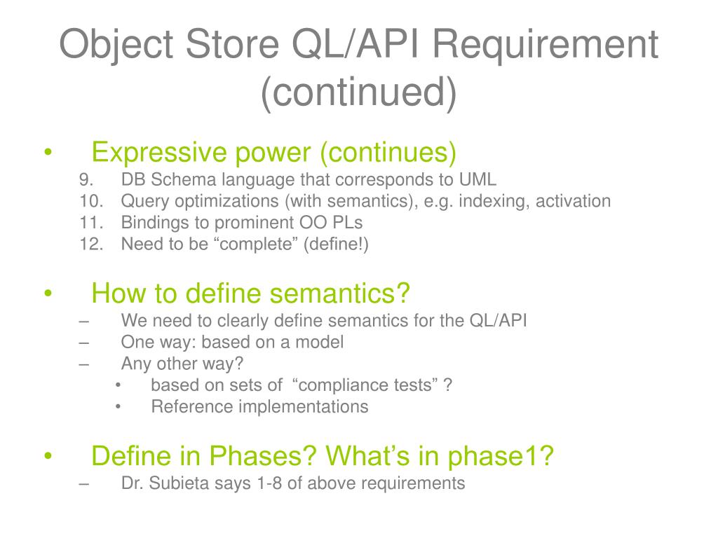 Object Store QL/API Requirement (continued) • Expressive power (continues) • DB Schema language that corresponds to UML • Query optimizations (with semantics), e.g. indexing, activation • Bindings to prominent OO PLs • Need to be “complete” (define!) • How to define semantics? • We need to clearly define semantics for the QL/API • One way: based on a model • Any other way? • based on sets of “compliance tests” ? • Reference implementations • Define in Phases? What’s in phase1? • Dr. Subieta says 1-8 of above requirements