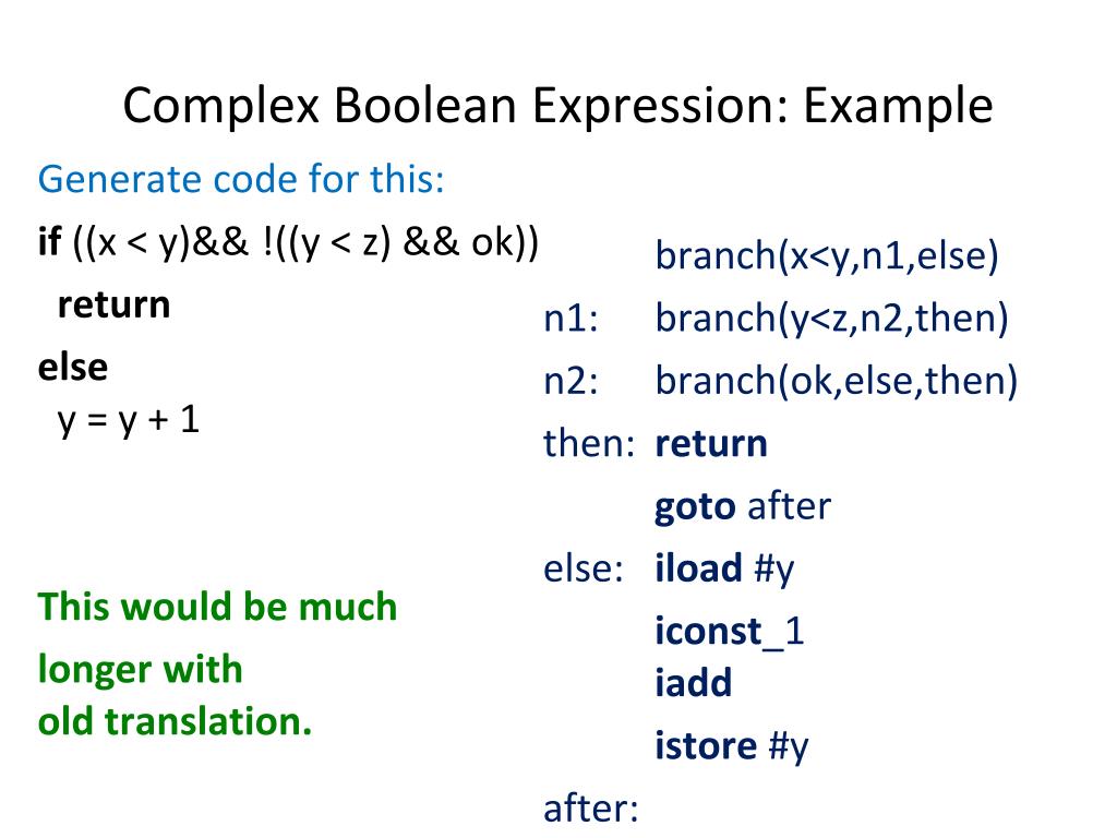 Complex Boolean Expression: Example Generate code for this: if((x < y)&& !((y < z) && ok)) return elsey = y + 1 This would be much longer with old translation. branch(x<y,n1,else) n1:branch(y<z,n2,then) n2: branch(ok,else,then) then: return gotoafter else: iload #y iconst_1iadd istore#y after: