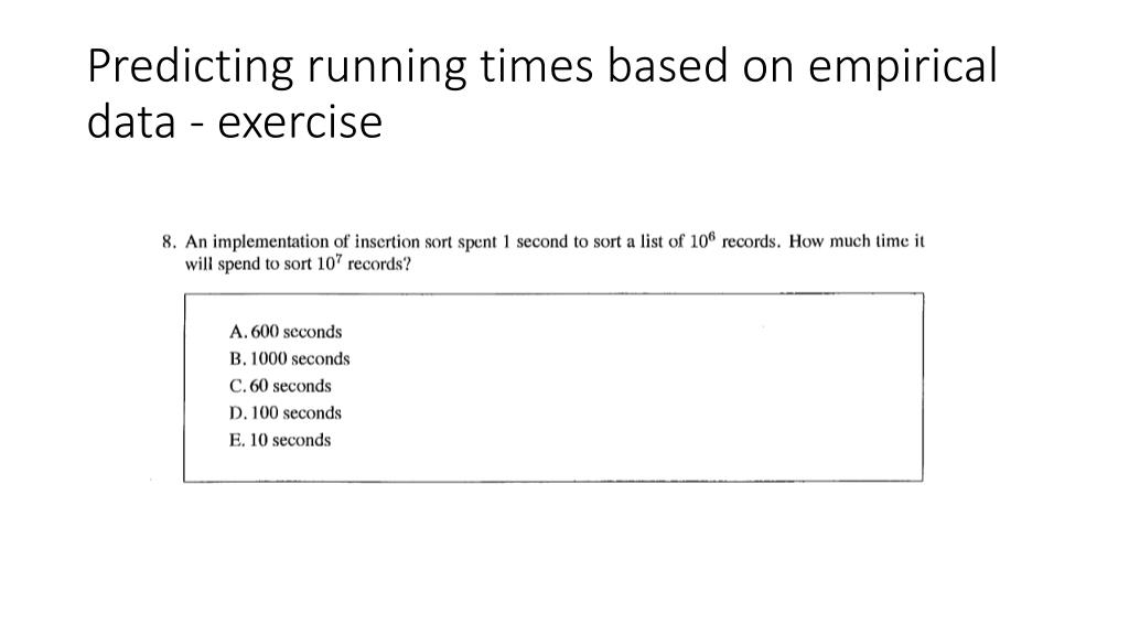 Predicting running times based on empirical data • Questions of the form “If quadratic/cubic/exponential/… algorithm X takes time t (or uses x elementary ops) to do 10 items, how long does it take to do 100 items?” Linearithmic = O(n log n) Now, with log to base 2: 10 log 10 ~= 10 * 3 = 30. So there’s seemingly very little in terms of factors or additive constants. 1000 log 1000 ~= 1000 * 10 = 10000, and 9000 comes closest to this number.