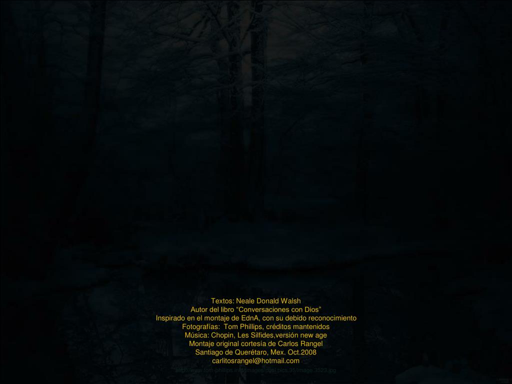 Textos: Neale Donald Walsh Autor del libro “Conversaciones con Dios” Inspirado en el montaje de EdnA, con su debido reconocimiento Fotografías: Tom Phillips, créditos mantenidos Música: Chopin, Les Silfides,versión new age Montaje original cortesía de Carlos Rangel Santiago de Querétaro, Mex. Oct.2008 carlitosrangel@hotmail.com http://www.tom-phillips.info/images/cool.pics.35/image.3523.jpg