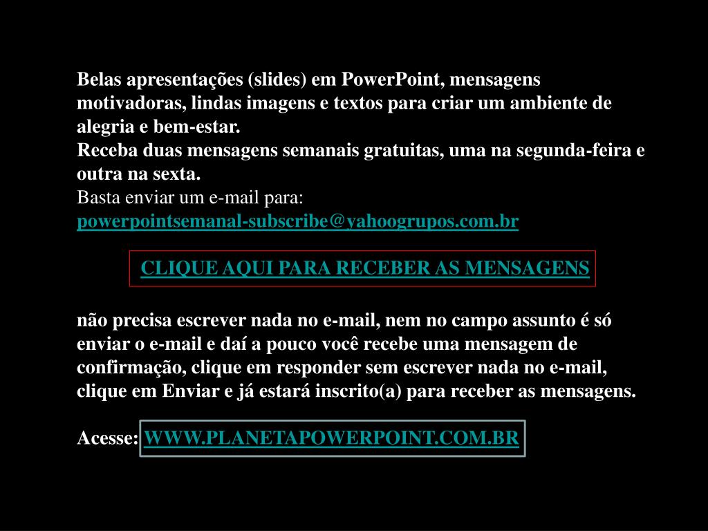 Belas apresentações (slides) em PowerPoint, mensagens motivadoras, lindas imagens e textos para criar um ambiente de alegria e bem-estar. Receba duas mensagens semanais gratuitas, uma na segunda-feira e outra na sexta. Basta enviar um e-mail para: powerpointsemanal-subscribe@yahoogrupos.com.br CLIQUE AQUI PARA RECEBER AS MENSAGENS não precisa escrever nada no e-mail, nem no campo assunto é só enviar o e-mail e daí a pouco você recebe uma mensagem de confirmação, clique em responder sem escrever nada no e-mail, clique em Enviar e já estará inscrito(a) para receber as mensagens. Acesse: WWW.PLANETAPOWERPOINT.COM.BR