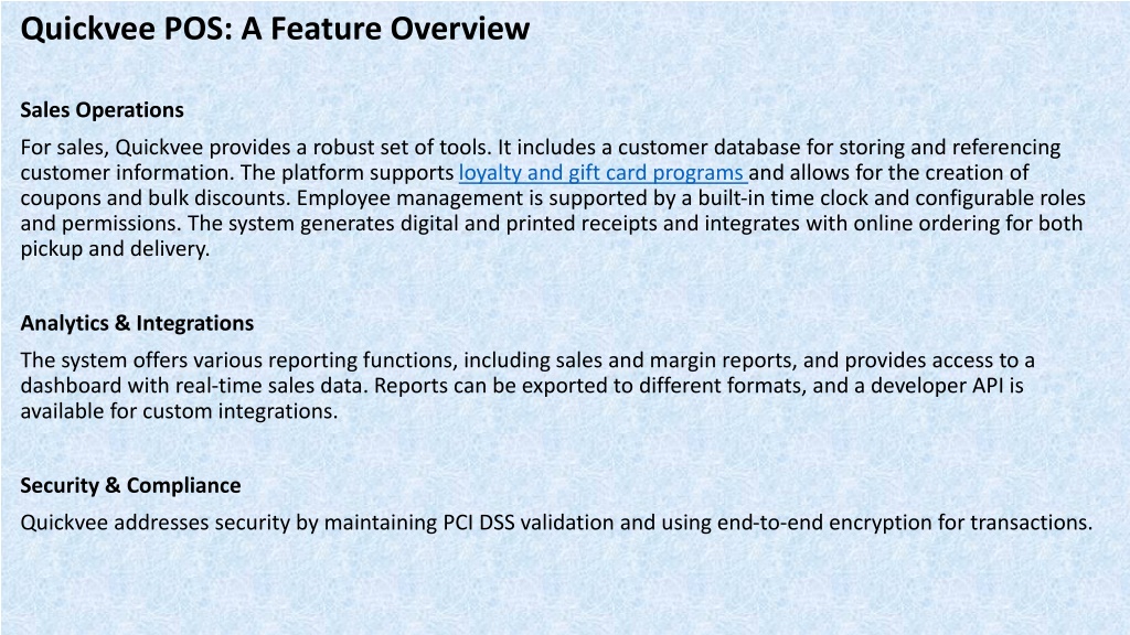 10. Quickvee POS: A Feature Overview Sales Operations For sales, Quickvee provides a robust set of tools. It includes a customer database for storing and referencing customer information. The platform supports loyalty and gift card programs and allows for the creation of coupons and bulk discounts. Employee management is supported by a built-in time clock and configurable roles and permissions. The system generates digital and printed receipts and integrates with online ordering for both pickup and delivery. Analytics & Integrations The system offers various reporting functions, including sales and margin reports, and provides access to a dashboard with real-time sales data. Reports can be exported to different formats, and a developer API is available for custom integrations. Security & Compliance Quickvee addresses security by maintaining PCI DSS validation and using end-to-end encryption for transactions.