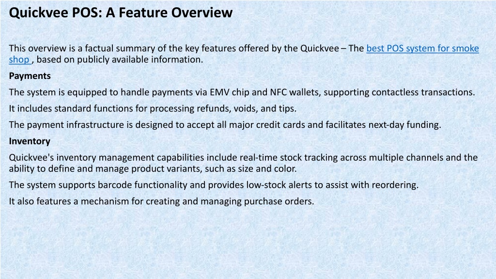 9. Quickvee POS: A Feature Overview This overview is a factual summary of the key features offered by the Quickvee – The best POS system for smoke shop , based on publicly available information. Payments The system is equipped to handle payments via EMV chip and NFC wallets, supporting contactless transactions. It includes standard functions for processing refunds, voids, and tips. The payment infrastructure is designed to accept all major credit cards and facilitates next-day funding. Inventory Quickvee's inventory management capabilities include real-time stock tracking across multiple channels and the ability to define and manage product variants, such as size and color. The system supports barcode functionality and provides low-stock alerts to assist with reordering. It also features a mechanism for creating and managing purchase orders.