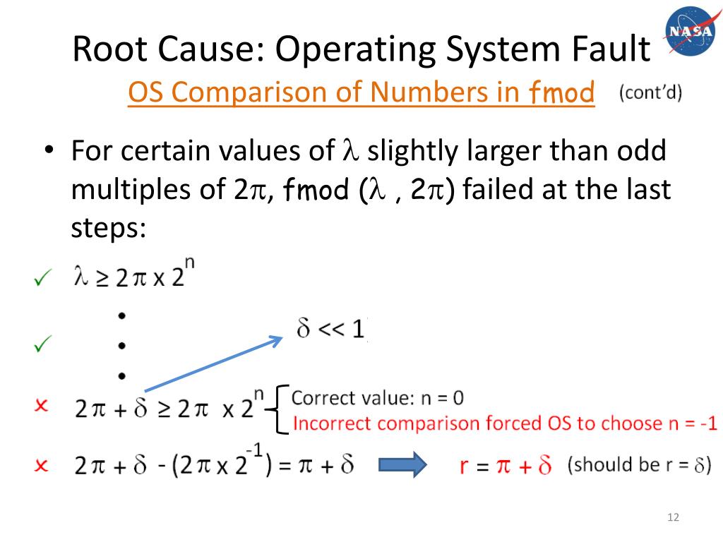 Root Cause: Operating System Faultfmod Overview • fmod (a , b) returning remainder of a ÷ b • Example: fmod (16 , 3) = 116 = (3 x 5) + 1 • Human implementation: Calculate the remainder r by finding the largest integer n in 16 = (3 x n) + r such that: 0 ≤ r = 16 – (3 x n) < 3