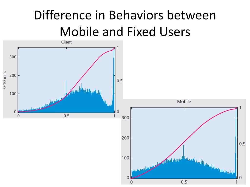 Difference in Behaviors between Mobile and Fixed Users • Give a comparison of viewing behaviors of mobile and fixed immobile users • The viewing completion proportion of video contents stratified in three classes of video lengths: 0~10 min, 20~30 min, and 40~50 min • Two types of access to PPTV: standalone PC client and mobile application