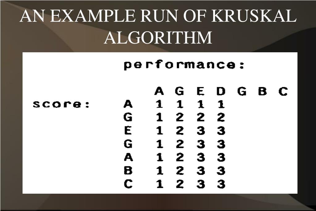 KRUSKAL'S ALGORITHM Populates a two-dimensional matrix. M[i][j] = length(lcs(s1[0..i],s2[0..j])). M[i][j] = max{M[i-1][j], M[i][j-1], if(s1[i]=s2[j]){1+M[i-1][j-1]} } Initialize first row and column. Back-track to find the common sub-sequence.