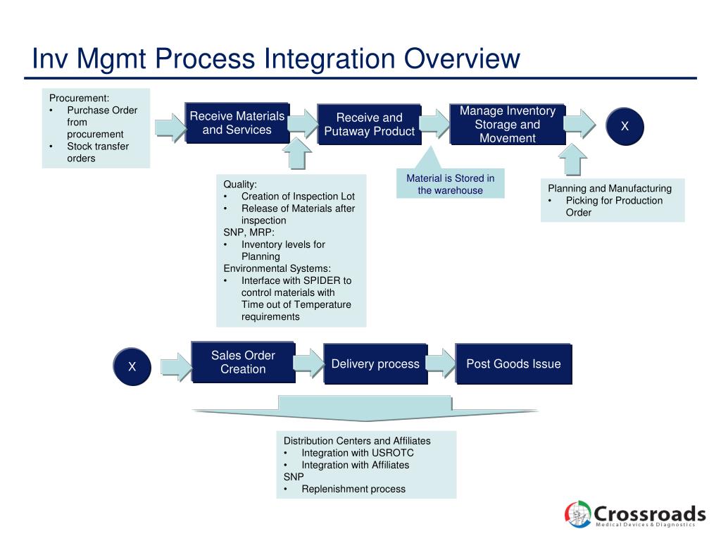 Inv Mgmt Process Integration Overview • Procurement: • Purchase Order from procurement • Stock transfer orders Receive Materials and Services Receive and Putaway Product Manage Inventory Storage and Movement X Material is Stored in the warehouse • Quality: • Creation of Inspection Lot • Release of Materials after inspection • SNP, MRP: • Inventory levels for Planning • Environmental Systems: • Interface with SPIDER to control materials with Time out of Temperature requirements • Planning and Manufacturing • Picking for Production Order Sales Order Creation Delivery process Post Goods Issue X • Distribution Centers and Affiliates • Integration with USROTC • Integration with Affiliates • SNP • Replenishment process