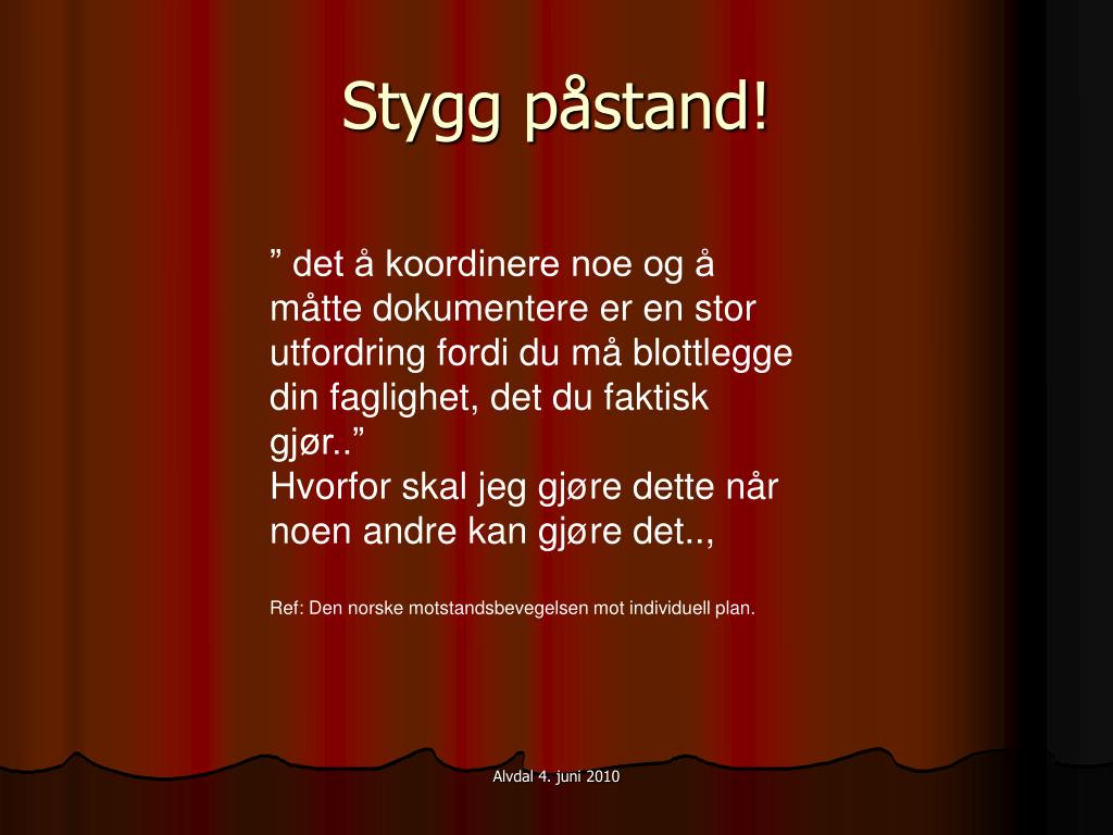 Stygg påstand! ” det å koordinere noe og å måtte dokumentere er en stor utfordring fordi du må blottlegge din faglighet, det du faktisk gjør..” Hvorfor skal jeg gjøre dette når noen andre kan gjøre det.., Ref: Den norske motstandsbevegelsen mot individuell plan. Alvdal 4. juni 2010