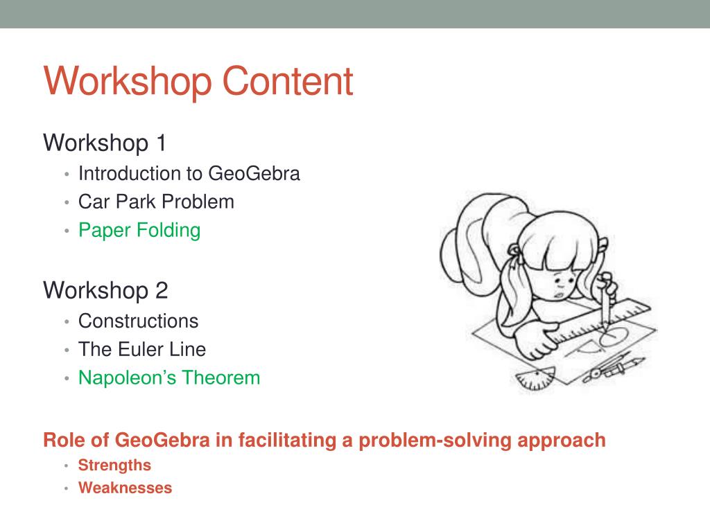 Workshop Content Workshop 1 • Introduction to GeoGebra • Car Park Problem • Paper Folding Workshop 2 • Constructions • The Euler Line • Napoleon’s Theorem Role of GeoGebra in facilitating a problem-solving approach • Strengths • Weaknesses